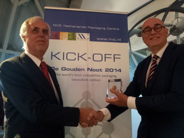 Chairman of the NVC Netherlands Packaging Centre Peter van der Knaap (right) presents a symbolic Gouden Noot trophy to the chairman of the jury Professor Onno Omta, thereby opening the entries to packaging innovation contest De Gouden Noot 2014. (High-resolution picture available via info@nvc.nl)